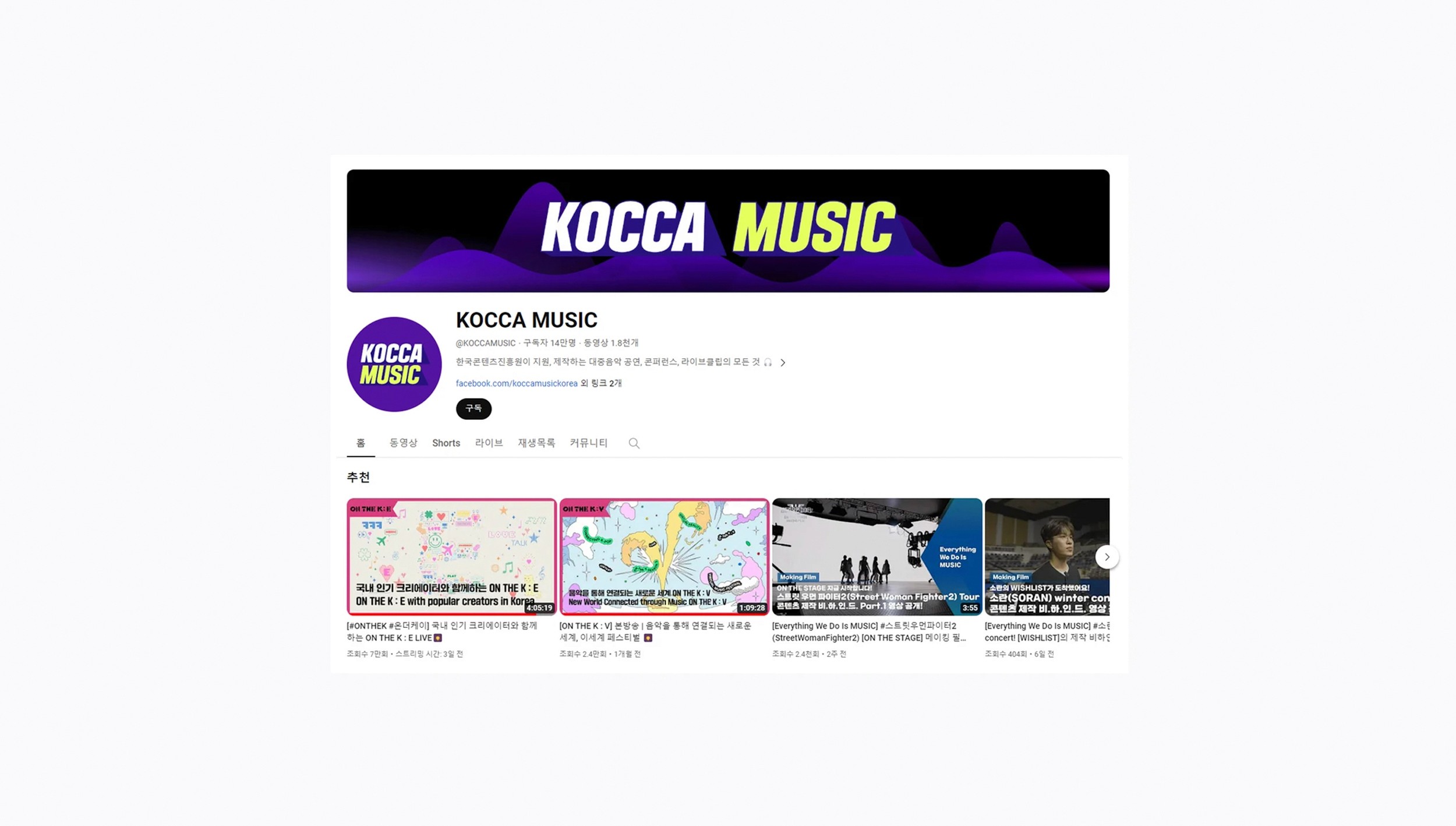 한국콘텐츠진흥원(KOCCA)에서 진행한 뮤직스튜디오 기획공연 ‘ON THE K’의 홍보 프로젝트로, KOCCA MUSIC 공식 채널을 기반으로 콘텐츠 기획·제작, 온라인 이벤트 운영, 유튜브 스트리밍, 언론 PR, 파워페이지 등 디지털 캠페인을 종합적으로 진행했습니다. 이를 통해 유튜브 구독자 1만 명 증가, 영상 누적 조회수 80만 회 이상이라는 성과를 달성했습니다.